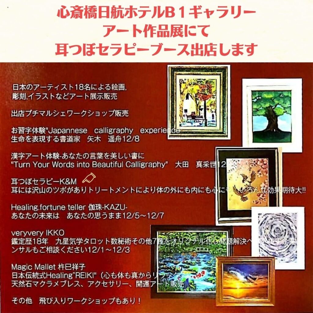大阪のど真ん中、心斎橋にある日航ホテルで開催されるアート作品展にて、耳つぼセラピーブースを出店します‼️