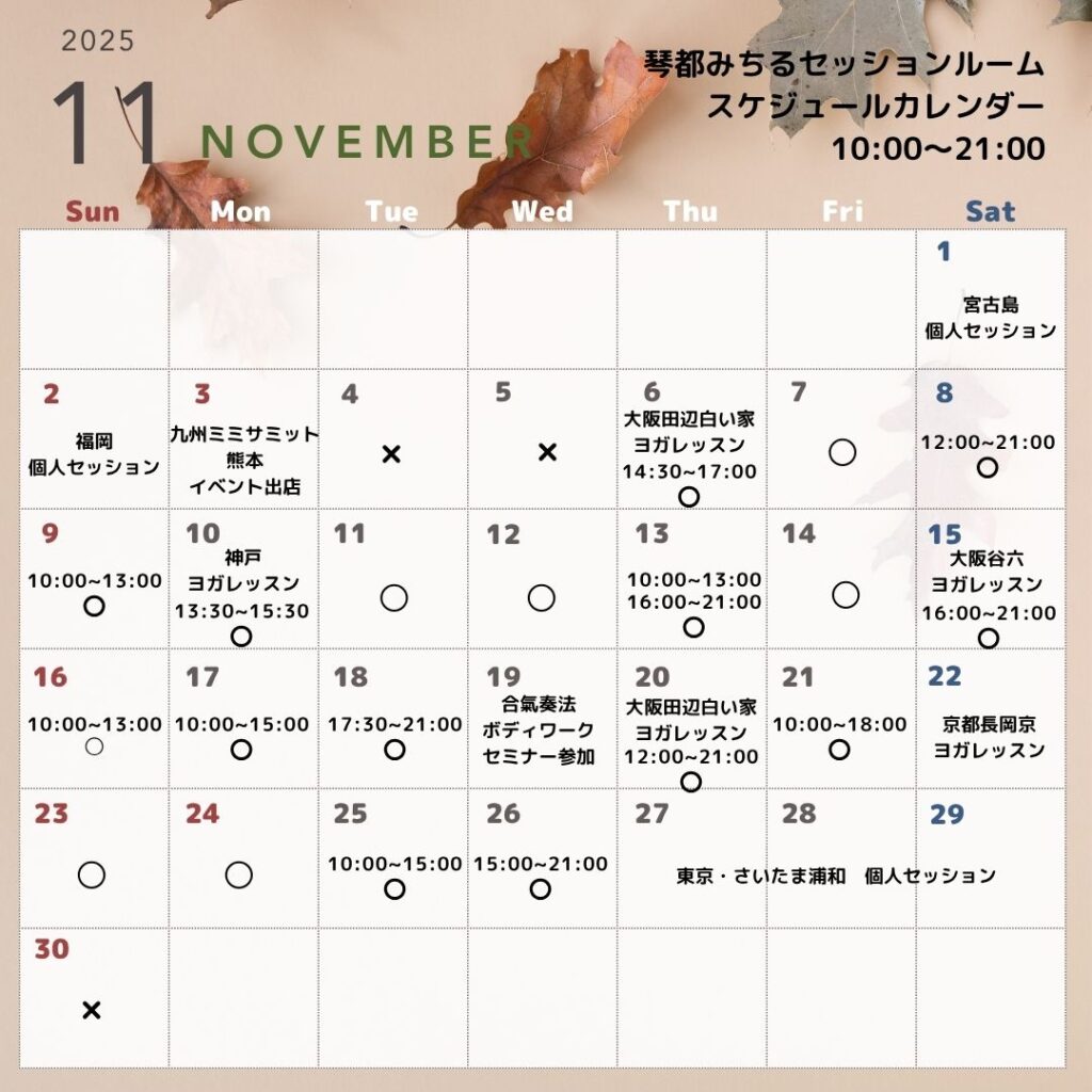 11月琴都みちるセッションルームスケジュール・営業カレンダーです。