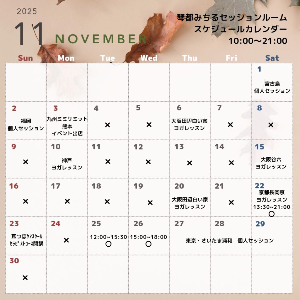 11月琴都みちるセッションルームスケジュール・営業カレンダーです。