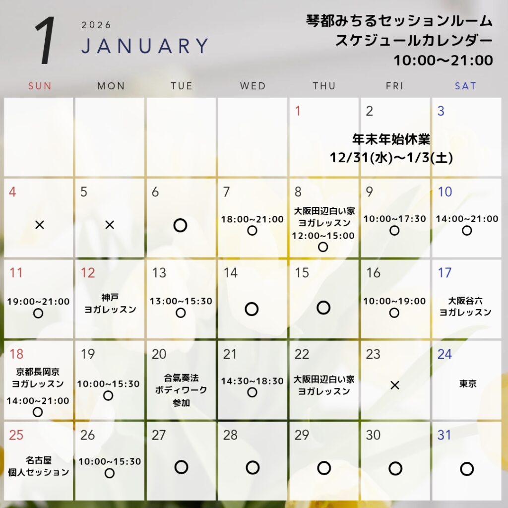 1月琴都みちるセッションルームスケジュール・営業カレンダーです。2月以降のご予約も承っております。