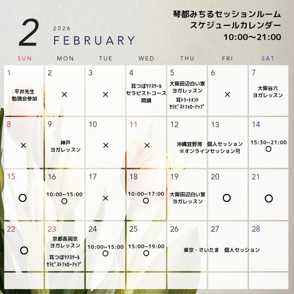 2月琴都みちるセッションルームスケジュール・営業カレンダーです。3月以降のご予約も承っております。