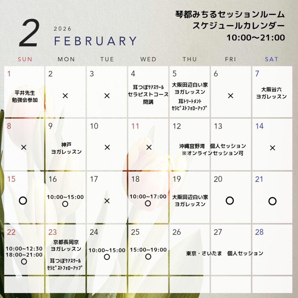 2月琴都みちるセッションルームスケジュール・営業カレンダーです。3月以降のご予約も承っております。